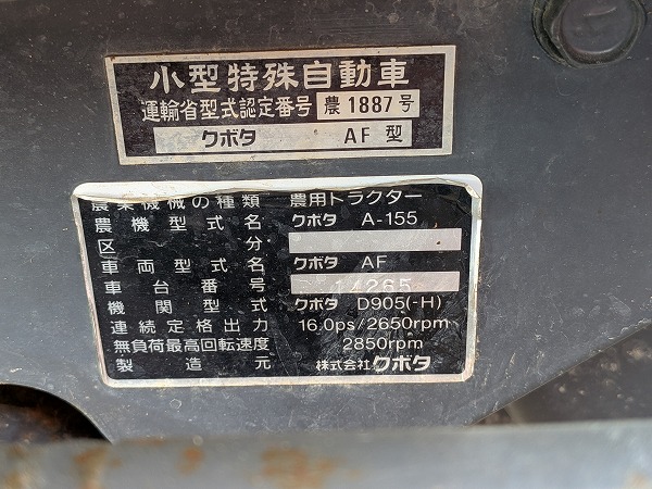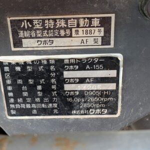 KUBOTA/ A-155D/ 14265/ 163h 2025-12-18 Spec: MAKER: KUBOTA MODEL: A-155D NUMBER: 14265 HOUR METER: 163h CONDITION: GOOD APPEARANCE AND GOOD CONDITION Inquire about this item. Note: Related posts: KUBOTA/ B1600D/ 19731/ 888h KUBOTA/ B1400D/ 16191 KUBOTA/ L1500S/ 28947/ 1122h KUBOTA/ X-24D/ 60831/ 870h KUBOTA/ A-17D/ 13253/ 851h Tractor | Tags: KUBOTA