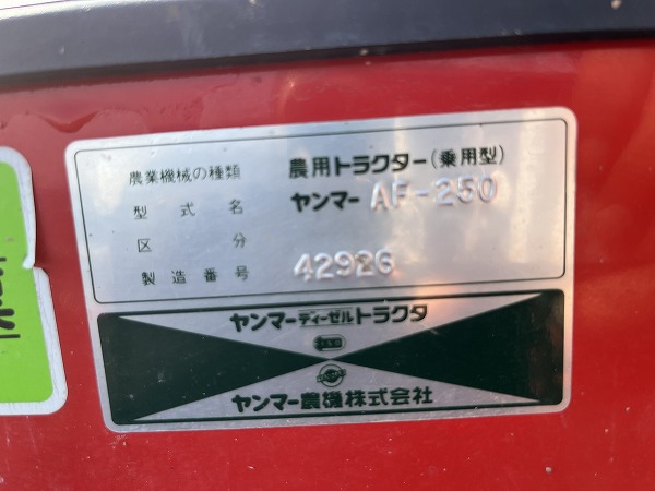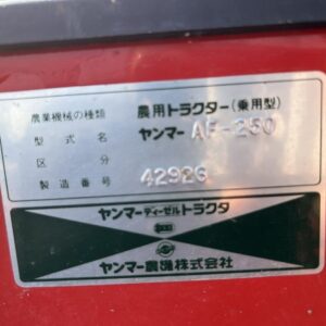 YANMAR/ AF250D/ 42926/ 1089h 2025-07-10 Spec: MAKER: YANMAR MODEL: AF250D NUMBER: 42926 HOUR METER: 1089h CONDITION: GOOD APPEARANCE AND GOOD CONDITION, WITH POWER STEERING Inquire about this item. Note: Related posts: YANMAR/ F220D/ 22509/ 848h YANMAR/ AF-18D/ 05312/ 849h YANMAR/ AF33D/ 21389/ 1106h YANMAR/ ke-2D/ 02190/ 383h YANMAR/ YM1720S/ 10040/ 1050h Tractor | Tags: YANMAR